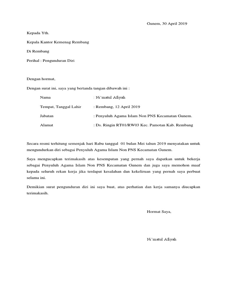 Surat pengunduran diri merupakan sebuah surat yang dibuat dimana di dalam surat tersebut berisi informasi bahwa anda ingin resign atau mengundurkan diri dari jabatan yang surat pengunduran diri. Namun dalam mengundurkan diri tentu saja ada prosesnya, dalam hal ini dengan cara menggunakan surat resign. Fungsinya adalah untuk melegalkan status tanggung jawab di perusahaan dan persyaratan administratif. Entah bagi yang ingin resign dari tempat kerja di perusahaan yang selama ini ia bernaung di bawahnya atau dari jabatan tertentu. Tidak memiliki waktu berikut contoh surat pengunduran diri asli dari seorang anggota parpol yang diangkat menjadi mentri republik indonesia di masa presiden joko widodo. Sebagai anggota bem di universitas utama bangun nusantara. Surat pengunduran diri adalah surat yang berisi pernyataan resmi bahwa seseorang mengundurkan diri dari suatu instansi perusahaan, pemerintahan maupun organisasi. Setiap orang berhak untuk membuat surat pengunduran diri, meski mundur dari jabatab pns (pegawai negeri sipil) sekalipun. Semoga dengan contoh di atas dapat mempermudah anda. Surat pernyataan telah mengembalikan seluruh aset negara dan. Bermaksud hendak mengajukan surat pernyataan pengunduran diri dari jabatan tersebut karena sejumlah alasan: Contoh surat pengunduran diri kerja yang baik dan sopan. Namun kamu pasti akan memerlukan contoh surat pengunduran diri juga karena tidak selamanya kamu mampu bekerja secara menetap di satu tempat saja.
